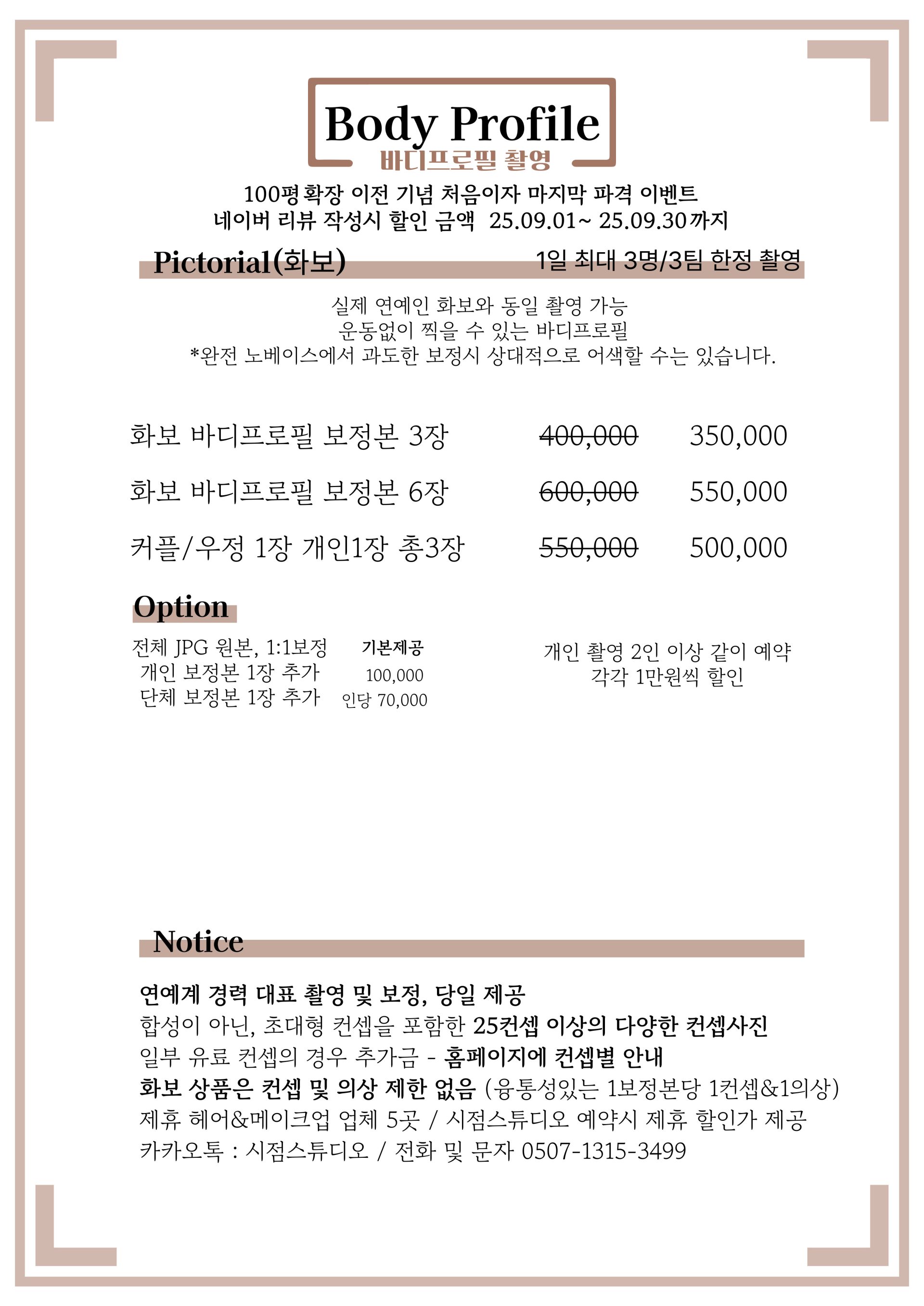 ◎화보 상품(프로필, 바디프로필)은 고객님들의 만족도 및 퀄리티를 최우선으로 하기 위해 예약제 100프로로 하루 1명~3명으로 마감합니다.